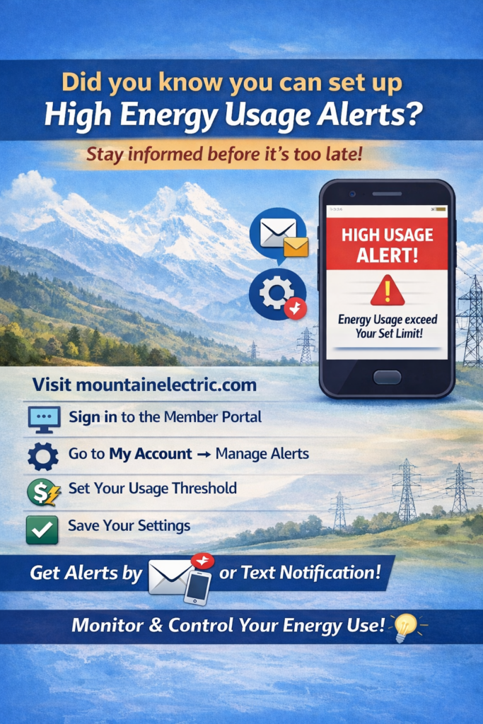 MEC also offers text and email notifications that you might find helpful. If you already have an account login set up, follow the steps below to sign up for High Usage Alerts. This may help indicate a problem with your HVAC system or hot water heater so the problem can get fixed before you get a unusually high electric bill. Often, customers don’t realize their heat pump or water heater is broken until they get their electric bill and see there’s a spike in electricity consumption. If you don’t have an account set up, visit our website and follow the prompts to create one.